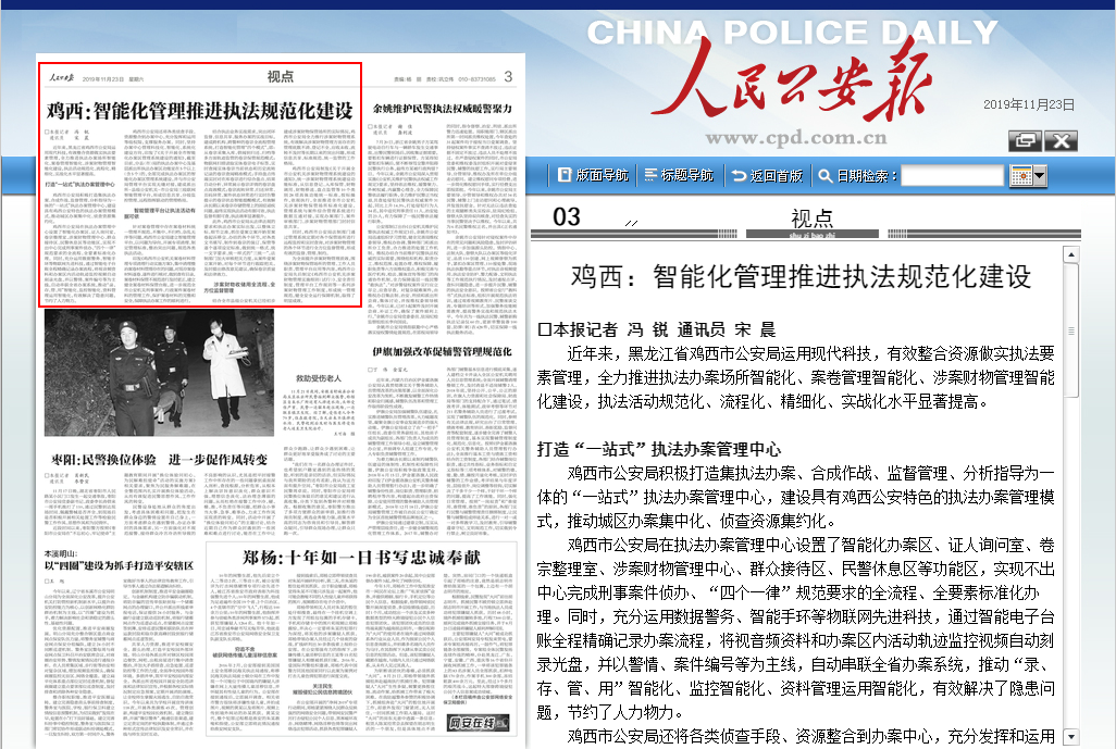 2019年11月23日,黑龍江省雞西市公安局執(zhí)法信息化建設項目榮登《人民公安報》03版“視點”欄目。海鄰科作為該項目承建方,為其提供了智慧執(zhí)法辦案管理中心解決方案,該方案包含案件管理中心、執(zhí)法辦案中心、涉案財物中心、卷宗管理中心,助雞西市公安局智能化管理推進執(zhí)法規(guī)范化建設。