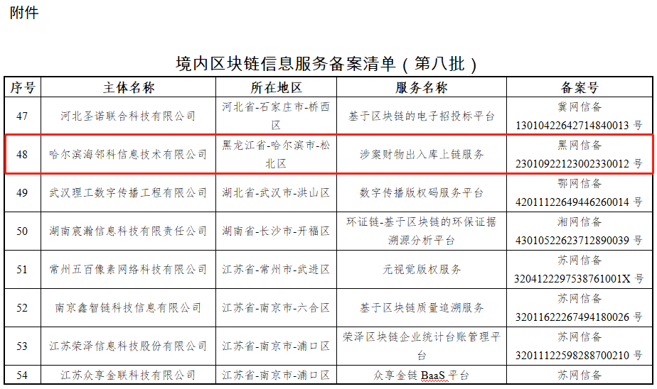 近日,國家互聯(lián)網(wǎng)信息辦公室關(guān)于發(fā)布第八批境內(nèi)區(qū)塊鏈信息服務(wù)備案編號的公告,海鄰科區(qū)塊鏈HylinkChain通過國家互聯(lián)網(wǎng)信息辦公室備案。這是黑龍江省政法行業(yè)首個(gè)獲備案編號的區(qū)塊鏈認(rèn)證資質(zhì)。