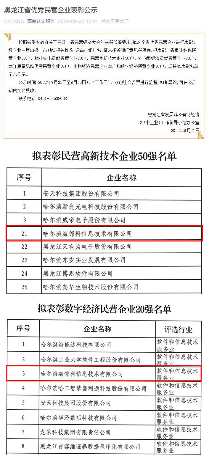近日,黑龍江省高新認(rèn)定服務(wù)發(fā)布了“黑龍江省優(yōu)秀民營企業(yè)表彰公示”通知,哈爾濱海鄰科公司憑借卓越的創(chuàng)新能力,獲評全省“民營高新技術(shù)企業(yè)50強(qiáng)”和“數(shù)字經(jīng)濟(jì)民營企業(yè)20強(qiáng)”企業(yè),受到省委、省政府的表彰!