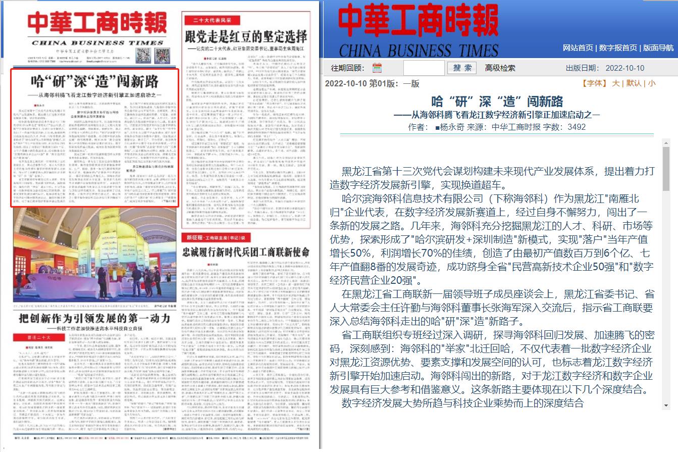 哈爾濱海鄰科信息技術(shù)有限公司(下稱(chēng)海鄰科)作為黑龍江"南雁北歸"企業(yè)代表,在數(shù)字經(jīng)濟(jì)發(fā)展新賽道上,經(jīng)過(guò)自身不懈努力,闖出了一條新的發(fā)展之路。幾年來(lái),海鄰科充分挖掘黑龍江的人才、科研、市場(chǎng)等優(yōu)勢(shì),探索形成了"哈爾濱研發(fā)+深圳制造"新模式,實(shí)現(xiàn)"落戶(hù)"當(dāng)年產(chǎn)值增長(zhǎng)50%,利潤(rùn)增長(zhǎng)70%的佳績(jī),創(chuàng)造了由最初產(chǎn)值數(shù)百萬(wàn)到6個(gè)億、七年產(chǎn)值翻8番的發(fā)展奇跡,成功躋身全省"民營(yíng)高新技術(shù)企業(yè)50強(qiáng)"和"數(shù)字經(jīng)濟(jì)民營(yíng)企業(yè)20強(qiáng)"。