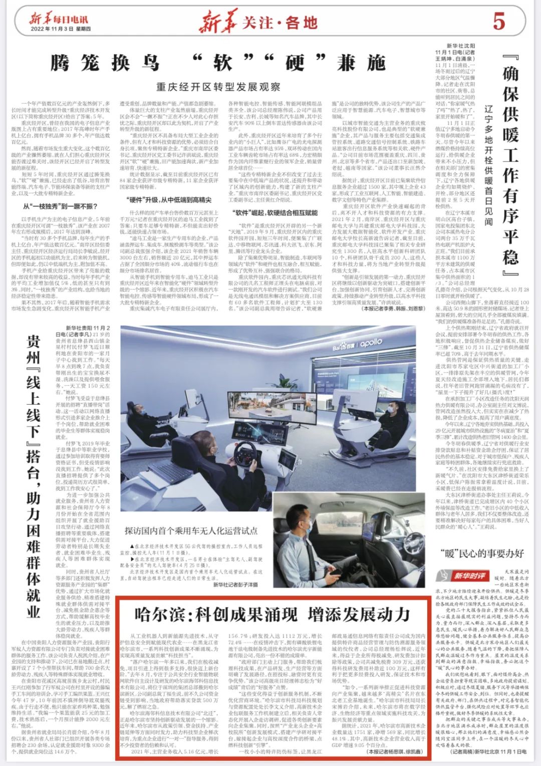 2022年11月3日,《新華每日電訊》報(bào)道《哈爾濱:科創(chuàng)成果涌現(xiàn) 增添發(fā)展動(dòng)力》,講述海鄰科"北遷",快速發(fā)展,科創(chuàng)成果不斷涌現(xiàn),正是哈爾濱市堅(jiān)持創(chuàng)新驅(qū)動(dòng)發(fā)展的一個(gè)縮影。哈爾濱市從政策引領(lǐng)、資金扶持、產(chǎn)業(yè)鏈延伸等方面同時(shí)發(fā)力,助力科技型企業(yè)梯次培育,為重點(diǎn)企業(yè)進(jìn)行“一對(duì)一”指導(dǎo)服務(wù),得到不少投資者的信賴和認(rèn)可。