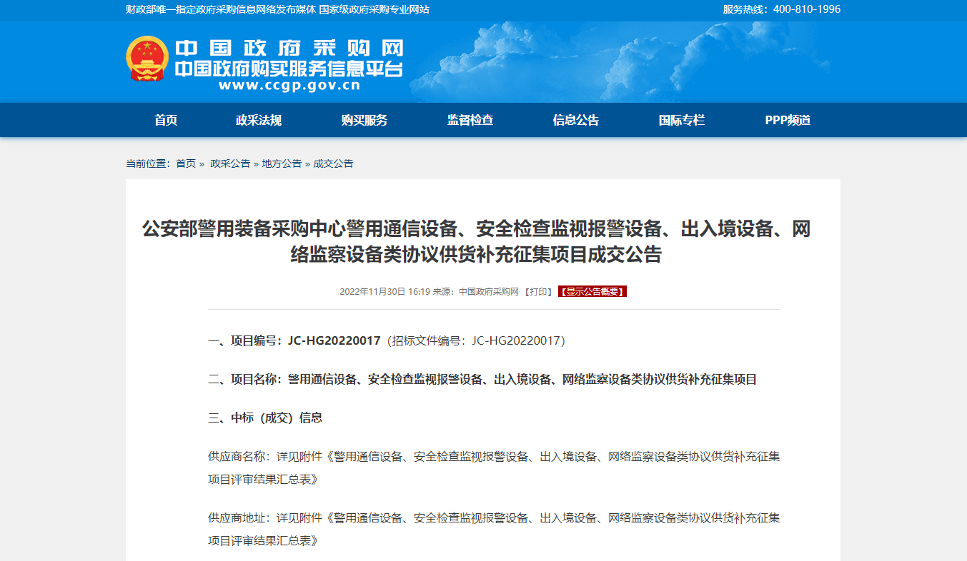 近日,中國(guó)政府采購(gòu)網(wǎng)發(fā)布“公安部警用裝備采購(gòu)中心警用通信設(shè)備、安全檢查監(jiān)視報(bào)警設(shè)備、出入境設(shè)備、網(wǎng)絡(luò)監(jiān)察設(shè)備類(lèi)協(xié)議供貨補(bǔ)充征集項(xiàng)目成交公告”,海鄰科自主研發(fā)9個(gè)型號(hào)的智慧警務(wù)執(zhí)法產(chǎn)品成功入圍公安部警用裝備采購(gòu)中心。