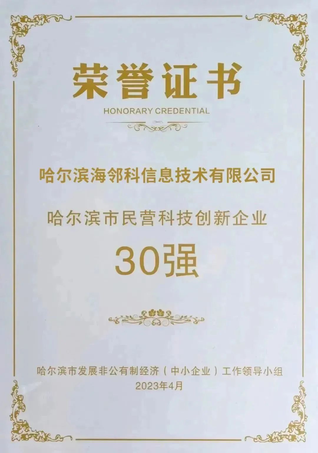4月4日,哈爾濱市召開民營(yíng)經(jīng)濟(jì)發(fā)展大會(huì),聚焦哈爾濱市民營(yíng)經(jīng)濟(jì)高質(zhì)量發(fā)展,表彰優(yōu)秀民營(yíng)企業(yè),安排部署民營(yíng)經(jīng)濟(jì)工作,全力支持民營(yíng)經(jīng)濟(jì)發(fā)展,促進(jìn)冰城現(xiàn)代化建設(shè)。哈爾濱海鄰科信息技術(shù)有限公司,依托持續(xù)的科技創(chuàng)新能力,榮獲“2023哈爾濱市民營(yíng)科技創(chuàng)新企業(yè)30強(qiáng)”。